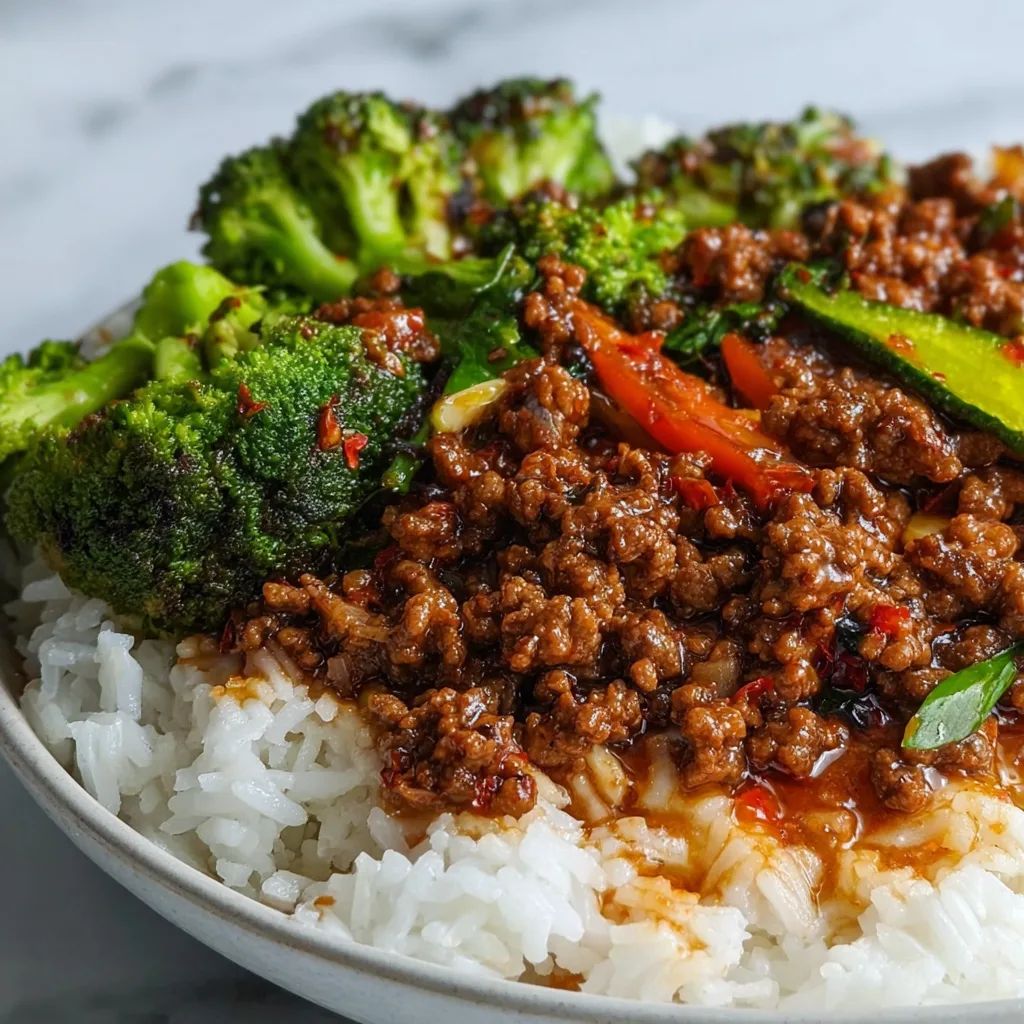 Spicy Ground Beef Stir-Fry Bowl with Garlic Veggies & Steamy Rice