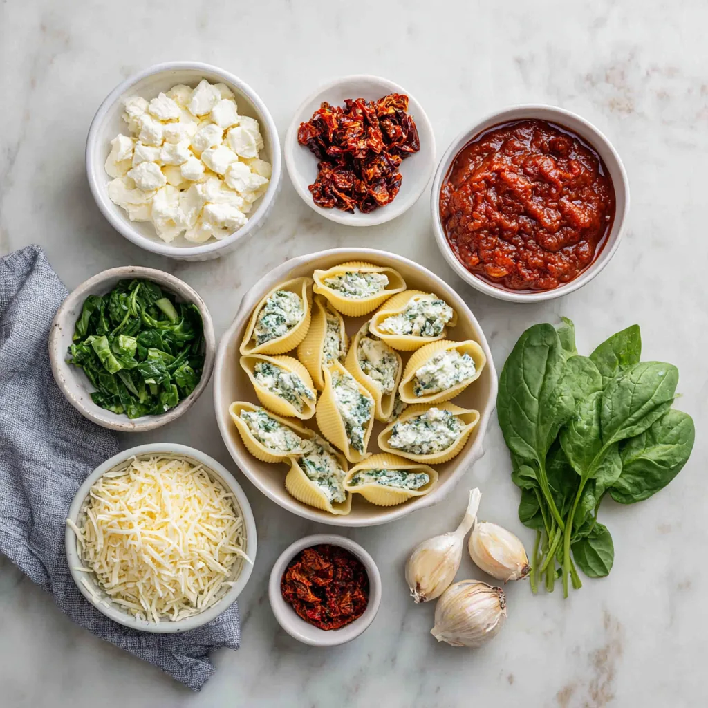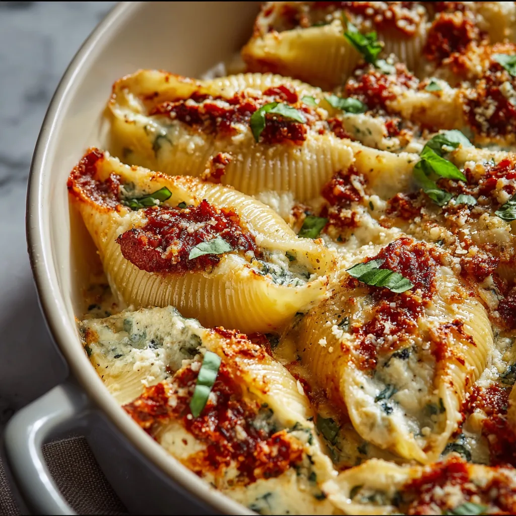 If you love creamy ricotta, tangy sun-dried tomatoes, and perfectly baked pasta, this recipe will become your new weeknight favorite. Each jumbo shell is stuffed with a luscious ricotta-spinach mixture, enhanced by bits of savory sun-dried tomato, then smothered in marinara sauce and melted cheese.