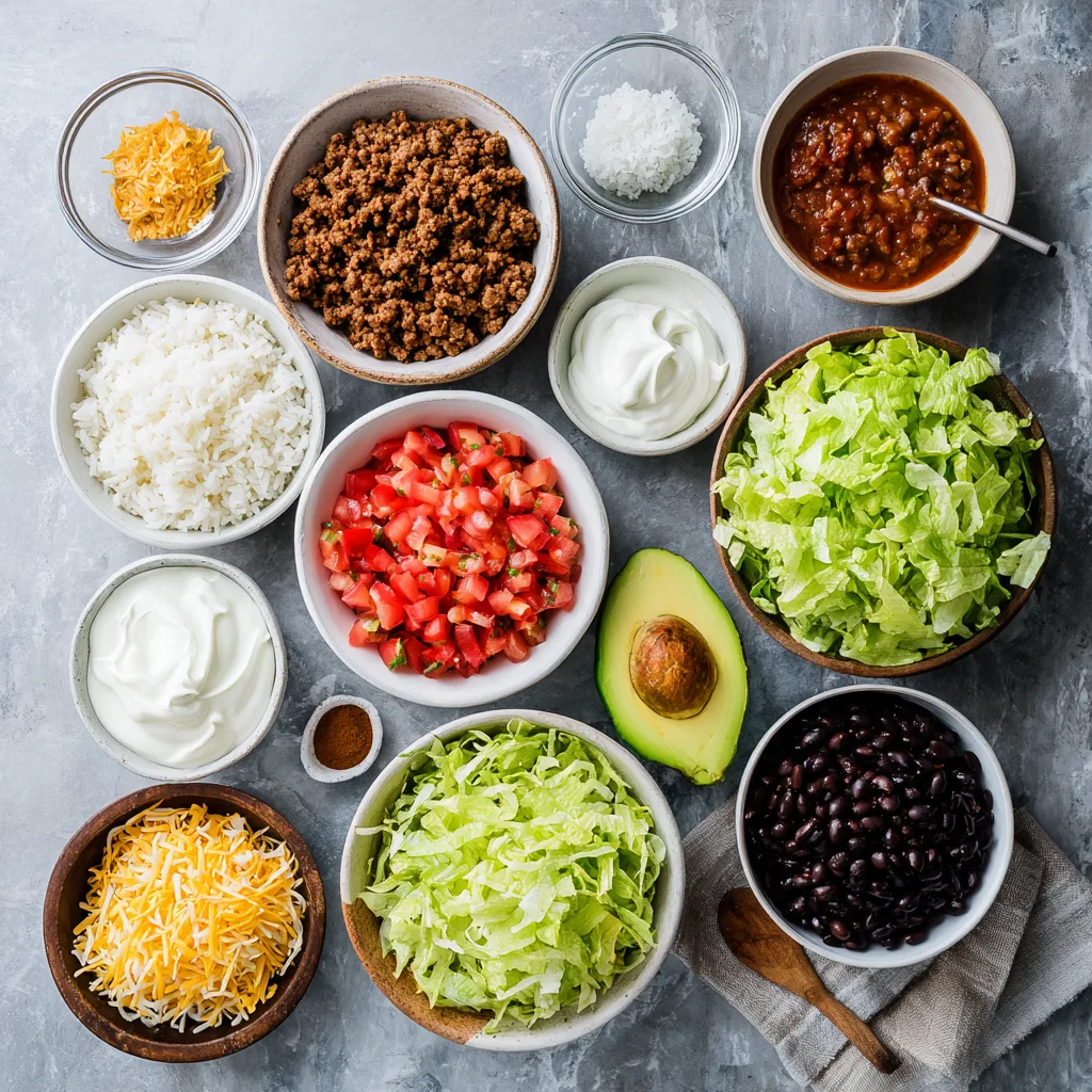 What makes a taco rice bowl so satisfying is the layering. Each component plays a role: