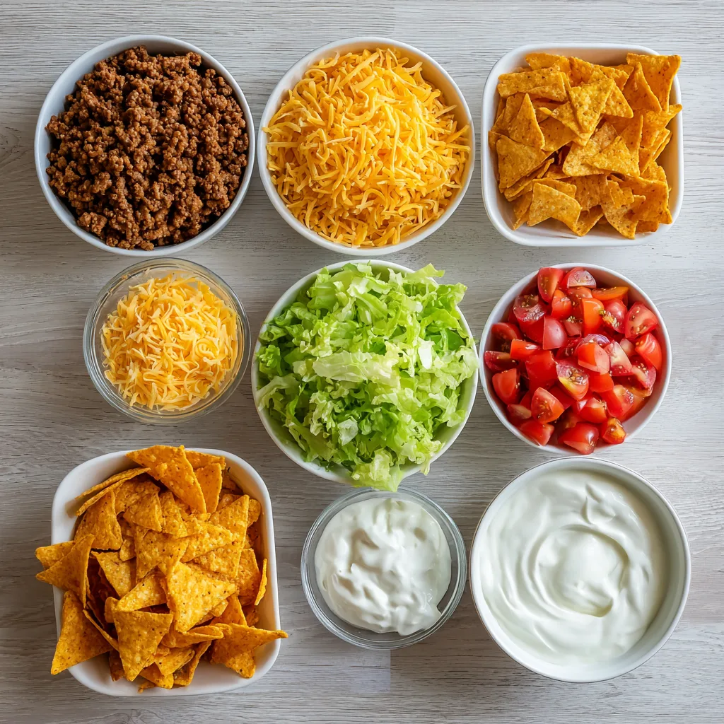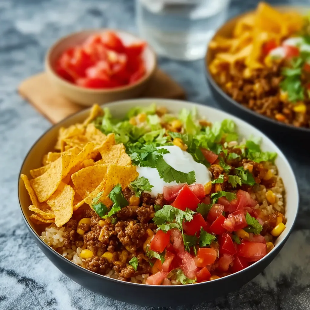 This recipe brings together textures and flavors that just make sense: tender rice, juicy taco-seasoned beef, crisp lettuce, creamy toppings, melty cheese, and crunchy chips. It’s a build-your-own-style bowl that lets everyone choose their perfect combination — the exact kind of meal that disappears the moment it hits the table.