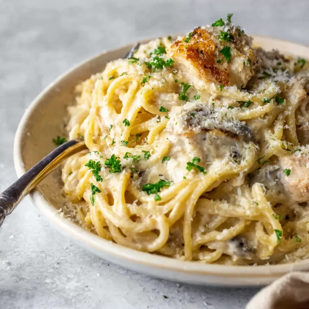 Add cooked pasta, shredded chicken, and sautéed mushrooms into the sauce. Toss gently to coat every noodle.
