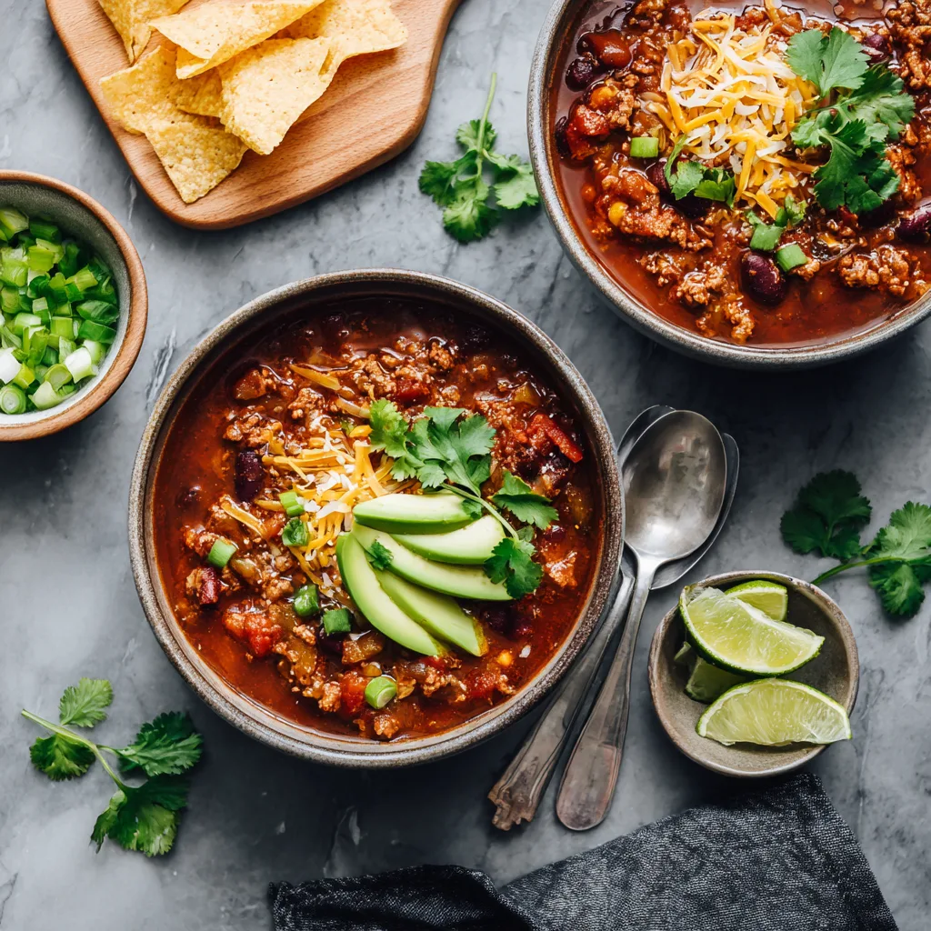 A combination of chili powder, cumin, and smoked paprika gives the chili a rich, layered taste.