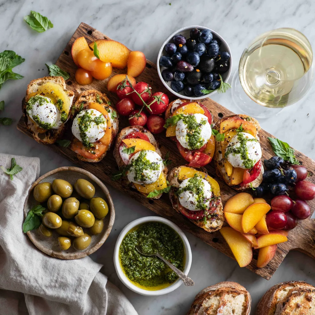 Imagine a platter filled with juicy tomatoes, ripe peaches, creamy burrata, and toasted crostini. Each bite offers a perfect balance of sweetness, creaminess, crunch, and freshness.