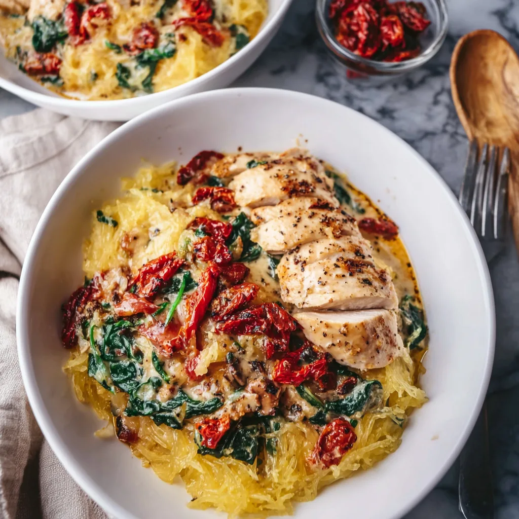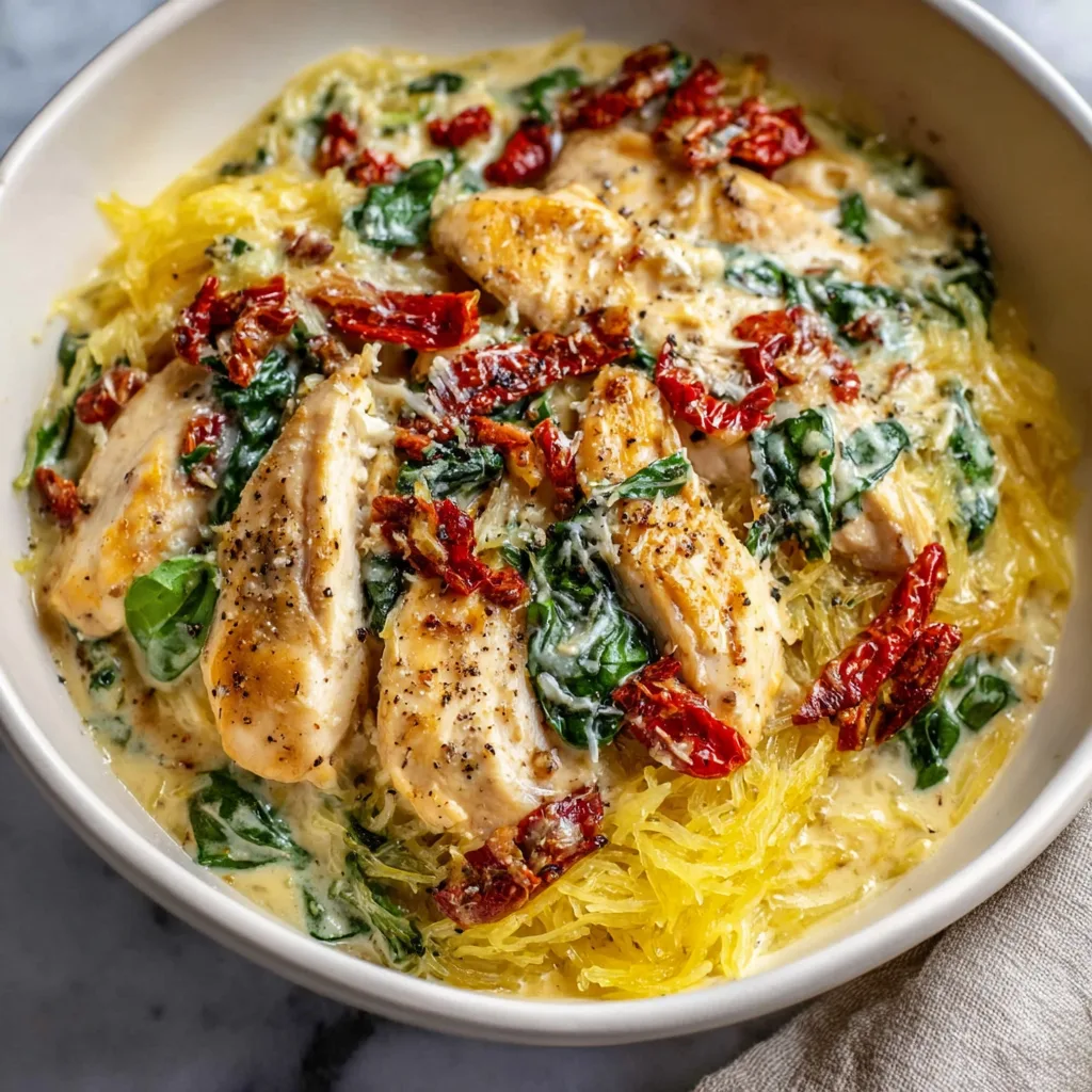 Tuscan Chicken and Spaghetti Squash (Creamy, Comforting, and Lighter)