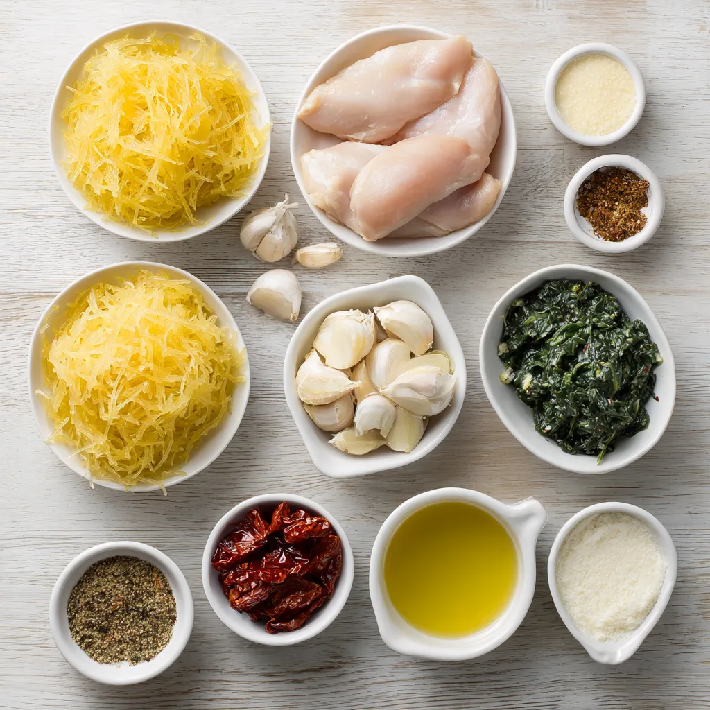 Tuscan chicken and spaghetti squash is the perfect marriage of rich, Italian-inspired flavor and lighter, wholesome ingredients. Tender chicken breasts simmered in a creamy garlic Parmesan sauce with sun-dried tomatoes and spinach are served over strands of roasted spaghetti squash, creating a dish that feels indulgent yet balanced.
