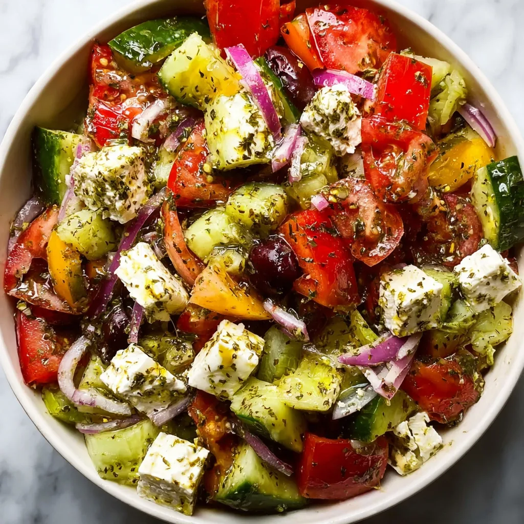For grab-and-go convenience, portion individual servings into mason jars or meal prep containers, layering the dressing at the bottom, followed by heartier vegetables like cucumbers and onions, then more delicate items like tomatoes and herbs on top. Add the vegan feta just before eating to maintain its texture and prevent it from absorbing too much moisture from the other ingredients.